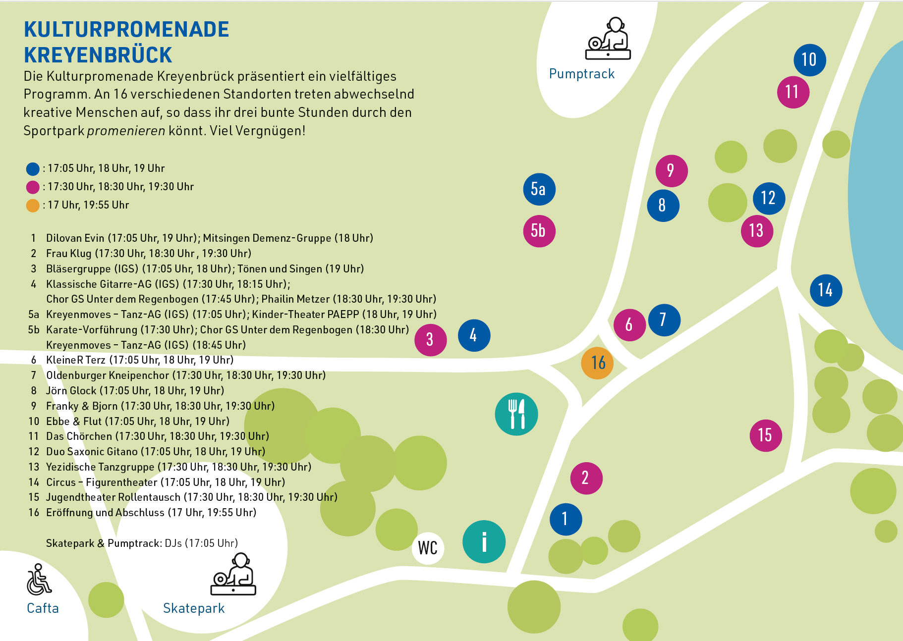 An 16 verschiedenen Standorten treten abwechselnd kreative Menschen auf, so dass ihr 3 bunte Stunden durch den Sportpark promenieren könnt.