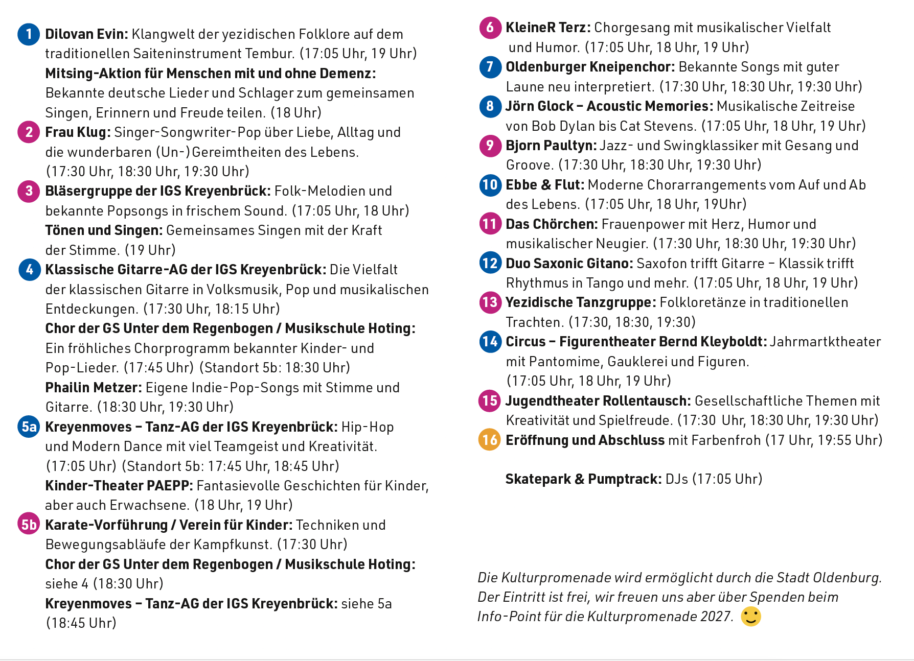 Die Kulturpromenade Kreyenbrück präsentiert am Freitag, den 08.Mai 2026 im Sportpark Kreyenbrück ein vielfältiges Programm 23 lokaler Kunst- und Kulturakteur*innen.